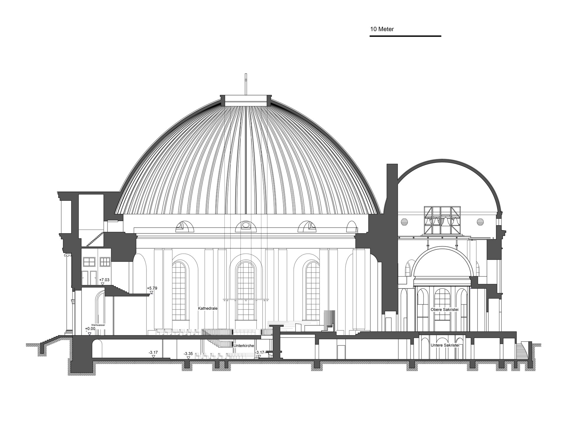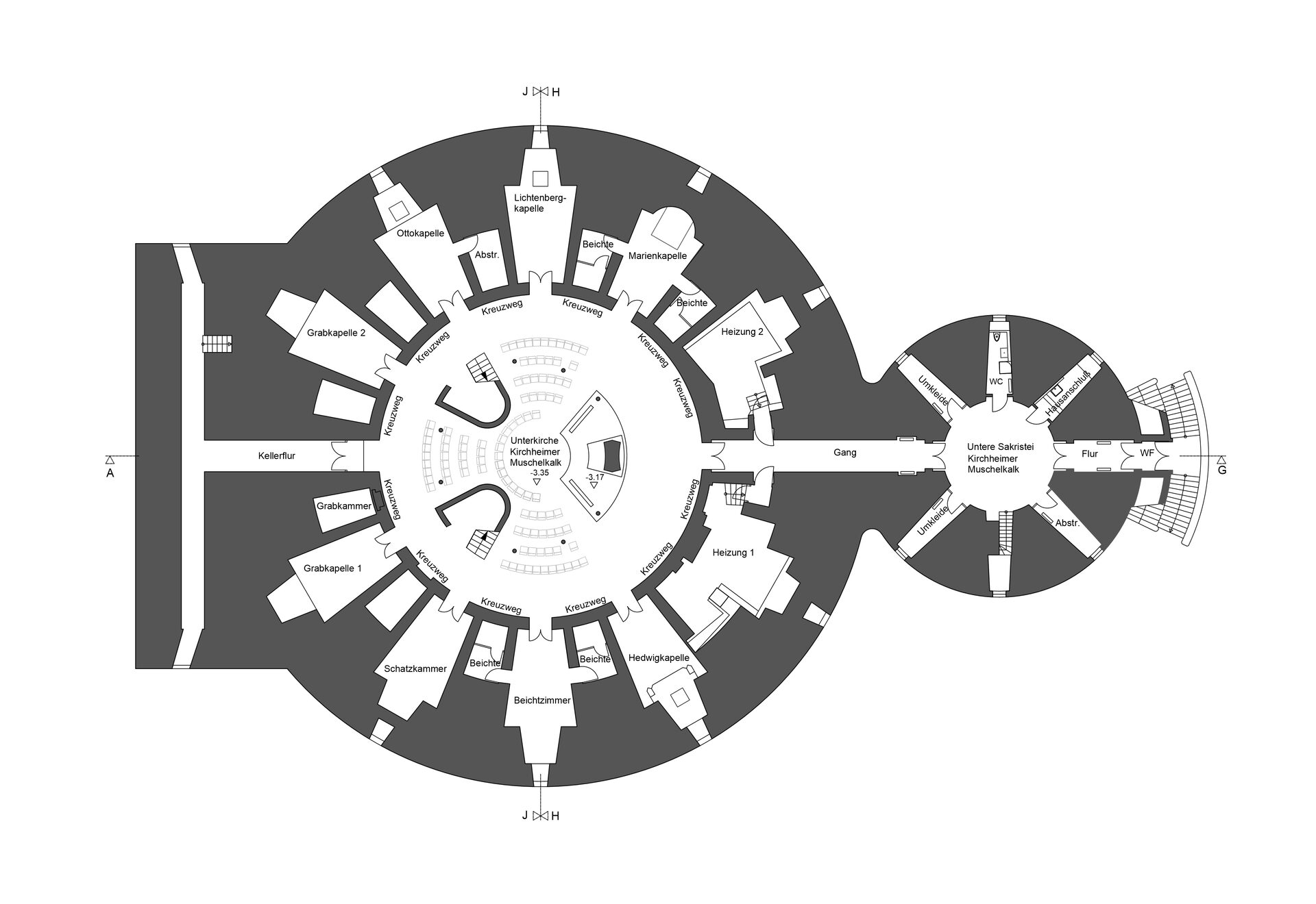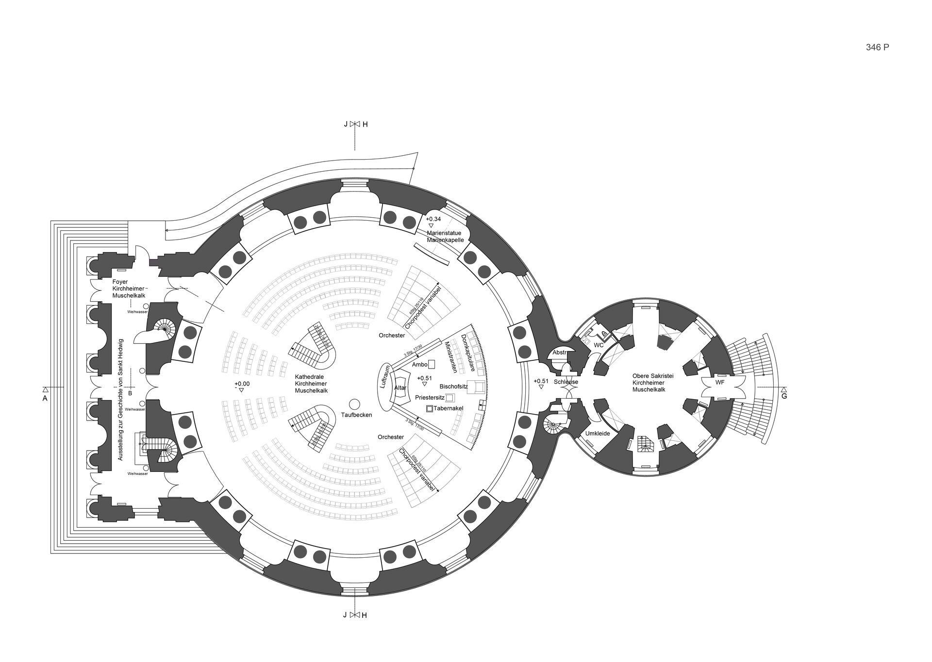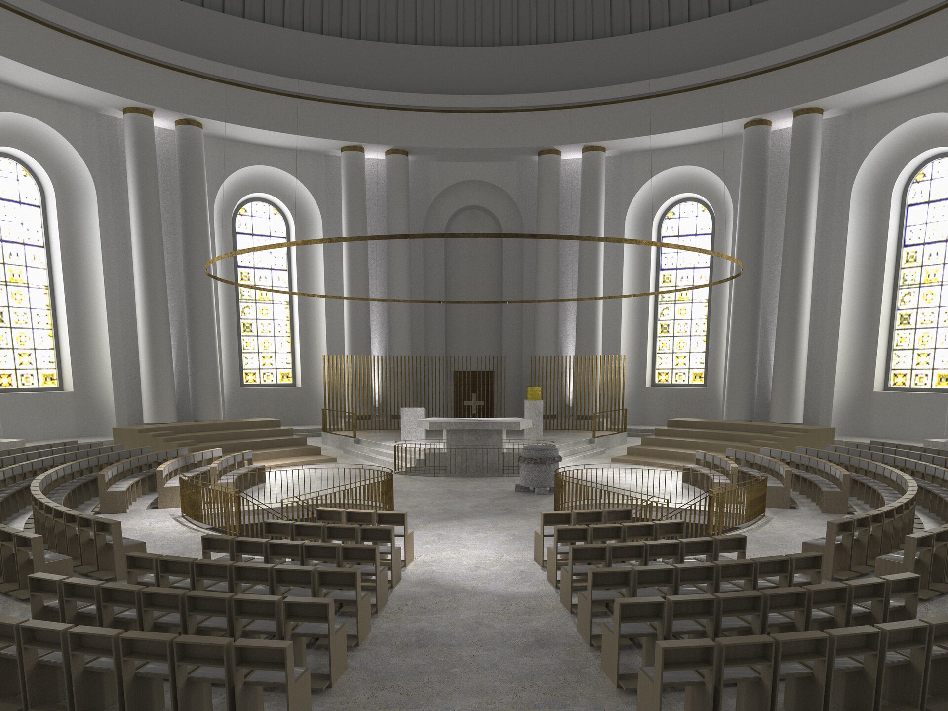 Die Öffnung vor dem Altarbereich wird wesentlich verkleinert und der in der Mitte liegende Treppenabgang geschloßen. In Verlängerung der beiden Seiteneingänge entstehen zwei Treppenanlagen, so daß ein Einzug über die Mittelachse zum Altarbereich möglich wird. Unter der Kuppel entsteht eine Mitte, um die sich die Besucher kreisförmig versammeln. Die Bestuhlung ist variabel und kann nach Bedarf erweitert oder anders aufgestellt werden. Ebenso sind die neben der Altarinsel angeordneten Chorpodeste veränderbar.