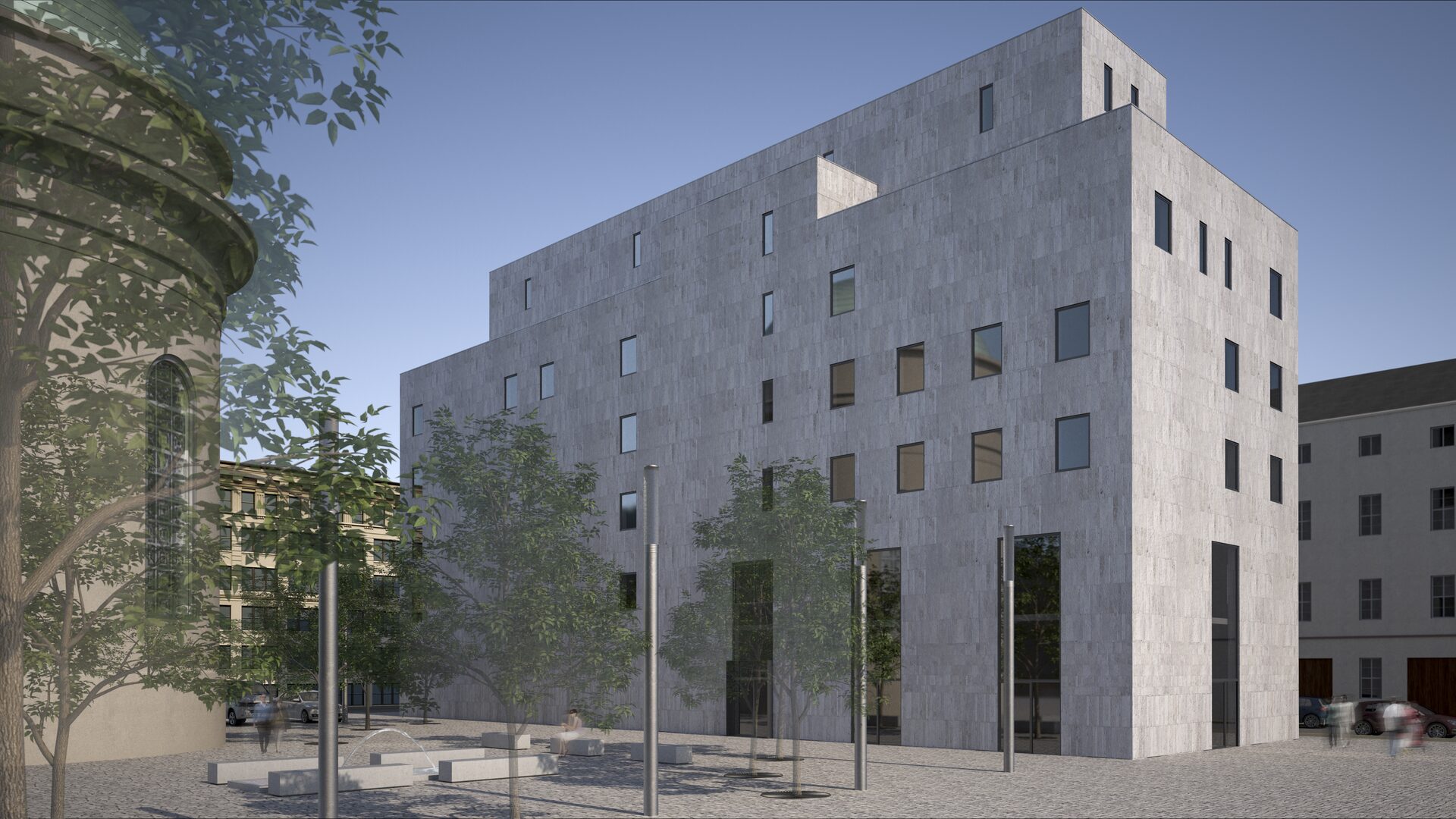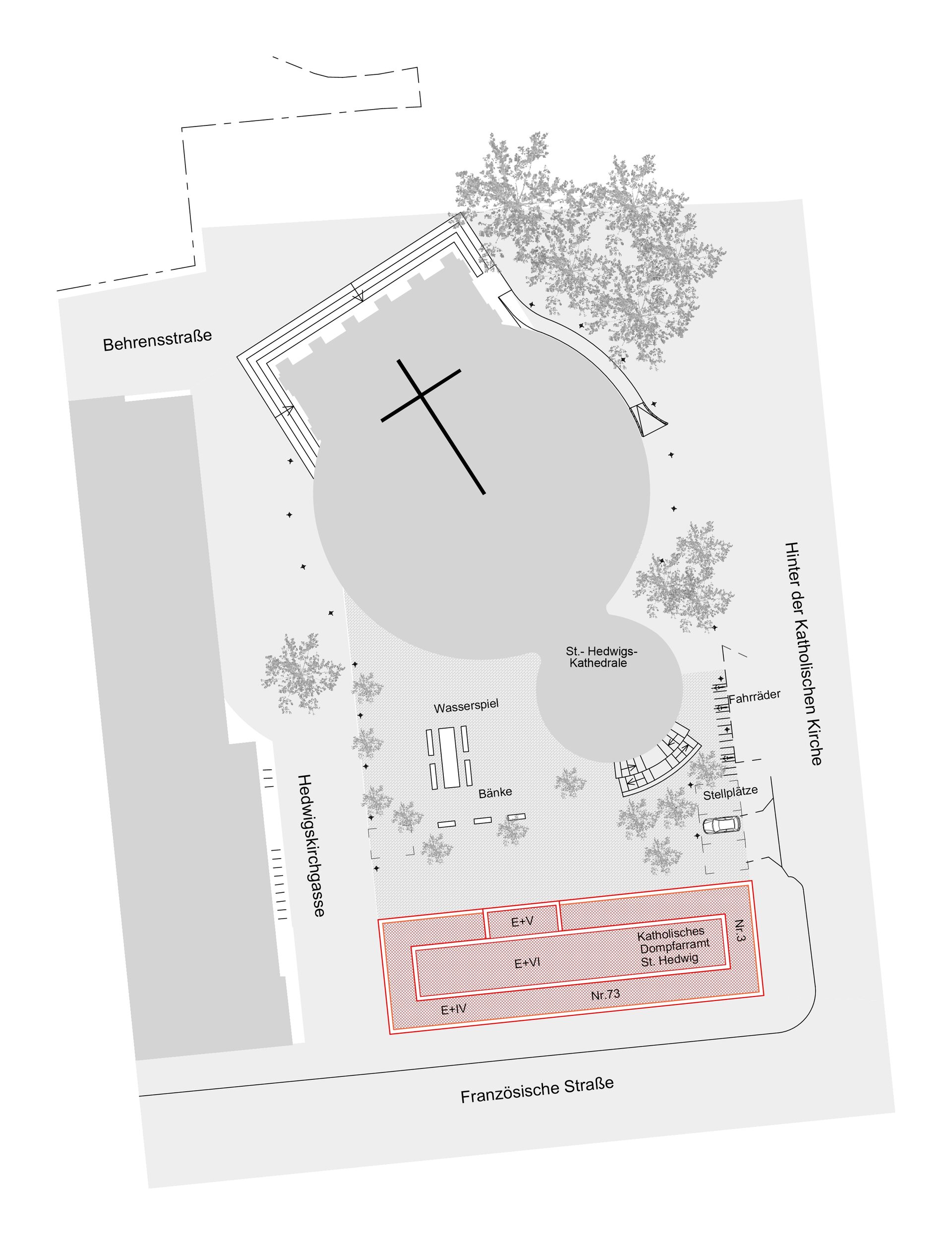 Das auf dem Grundstück liegende neu geplante Bernhard-Lichtenberg Haus beinhaltet zur Kathedrale gehörende ausgelagerte Funktionen und ist als Attraktionspunkt für Besucher vorgesehen. Ein städtischer Platz mit Wasserspiel und Bänken verbindet Kathedrale und Nebengebäude.