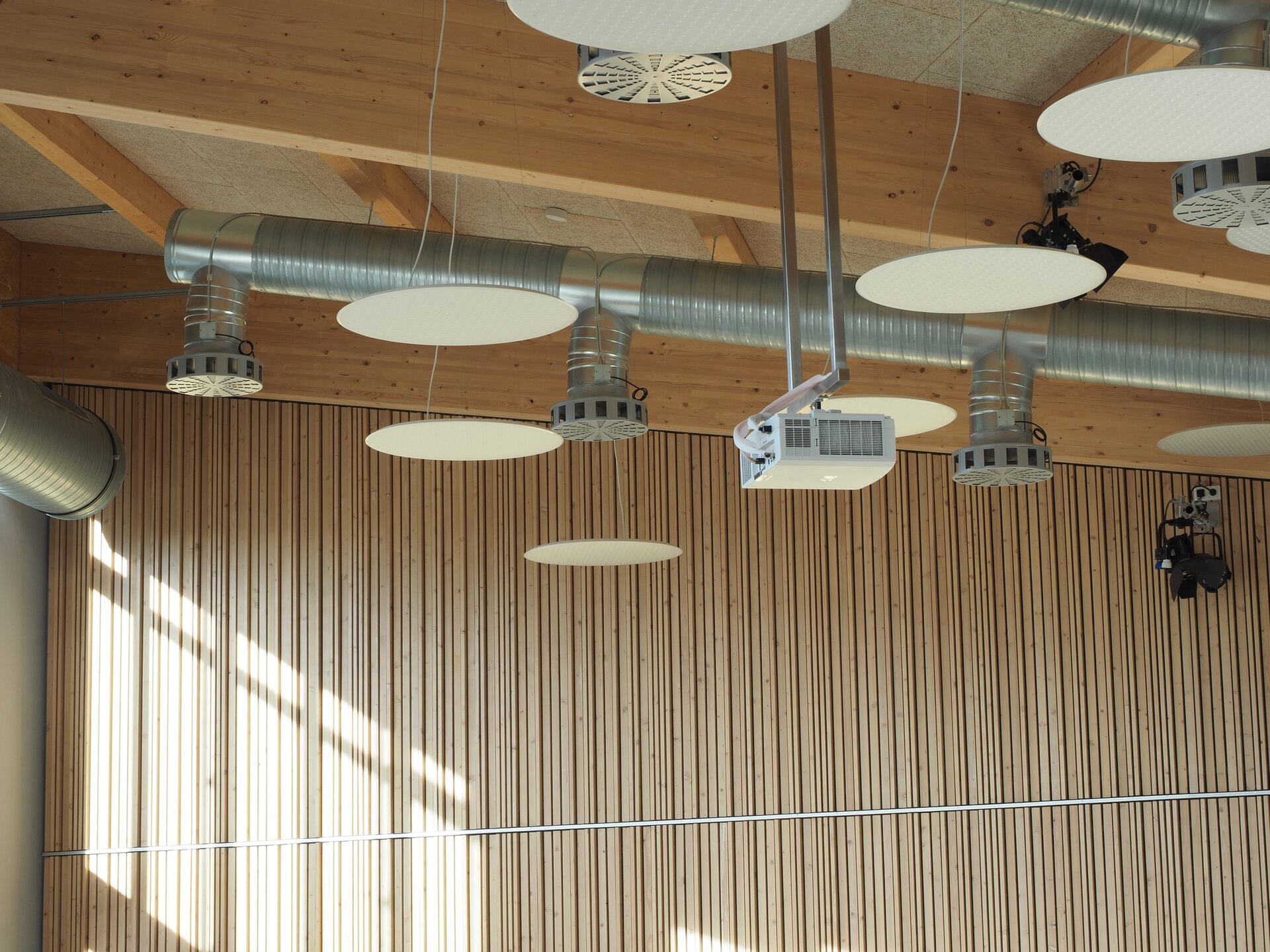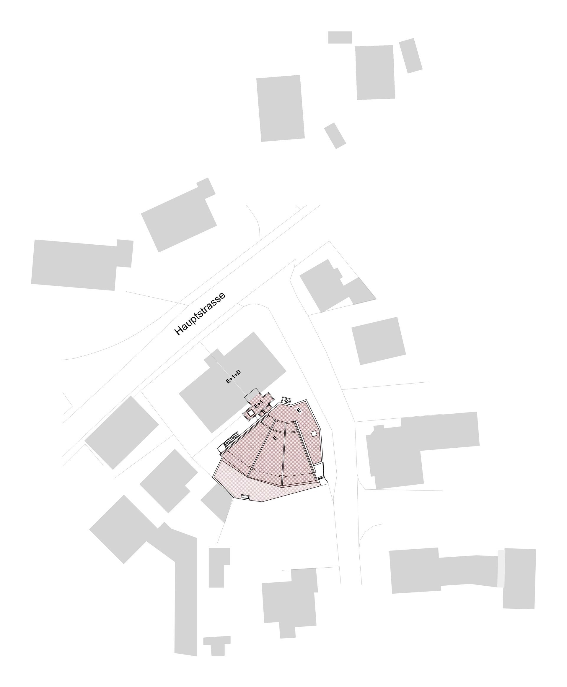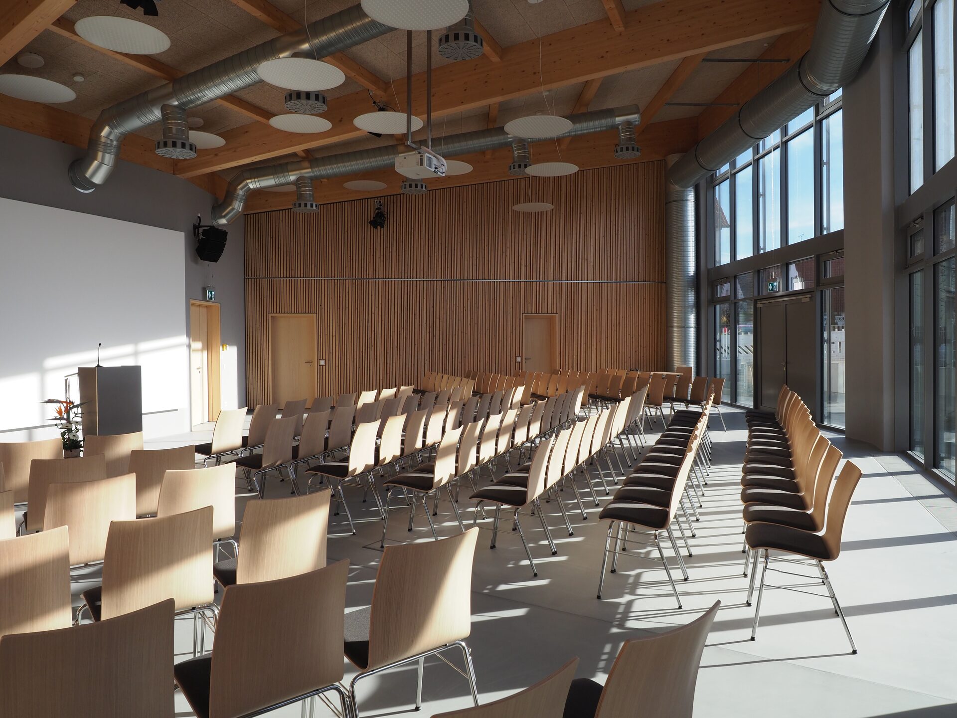 Der Tagungsraum bietet Platz für ca. 140 Sitzplätze. Über 2 Doppeltüren gelangt man ebenerdig auf den im Südwesten liegenden Freibereich mit Dachterrasse und Hochbeet. Vom Foyer aus wird außerdem der Küchenbereich und der Stahl-Glas-Verbindungsbau mit Treppe und Aufzug erschloßen, der 3 Geschosse überbrückt. Nebenräume, WC-Anlage, Stuhllager, Technikraum und Stellplätze sind im Untergeschoss angeordnet.