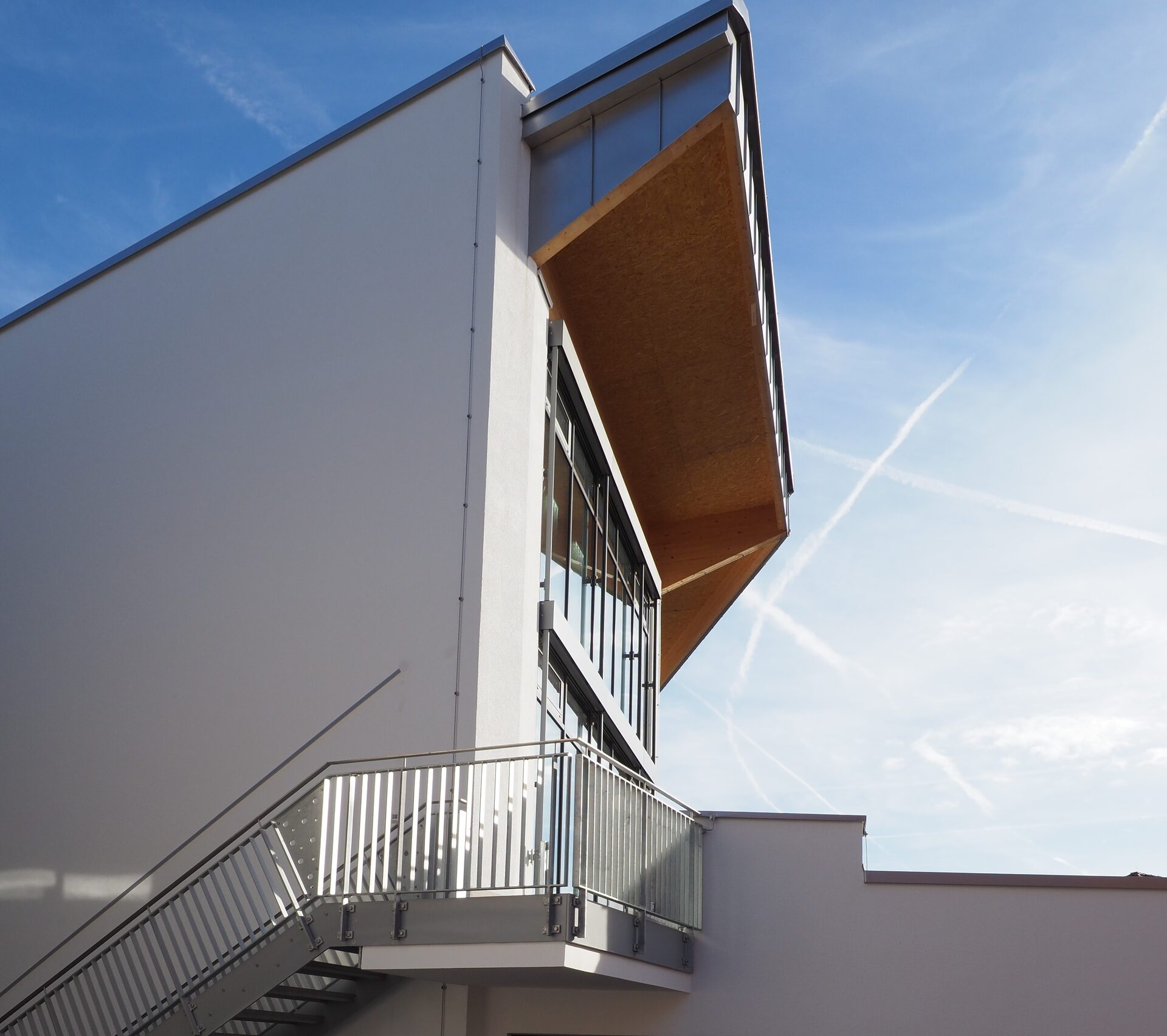 Der Baukörper besteht neben dem Bestandsgebäude aus drei Gebäudeelementen – einem 3-geschossigen Stahl-Glas-Bau mit Treppe und Aufzug zur Erschließung von Bestand und Neubau, einem Baukörper mit Flachdach der Windfang, Foyer und Küchenbereich enthält und dem viertelkreisförmigen Tagungsraum mit polygonal angeordneter Pfosten-Riegel-Glasfassade und Pultdach mit Edelstahldeckung.
